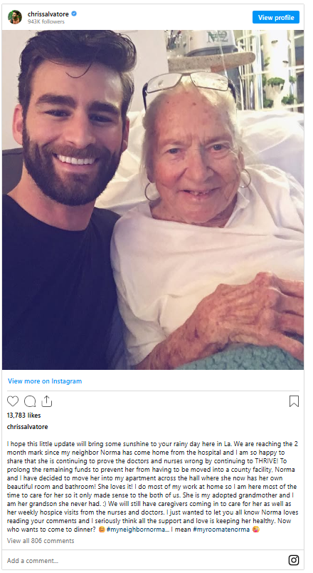 In 2013, Chris Salvatore moved in across the hall from Norma Cook, an 85-year-old woman, and her cat, Hermes. The two always said hello to each other, but after Salvatore introduced himself they became fast friends.