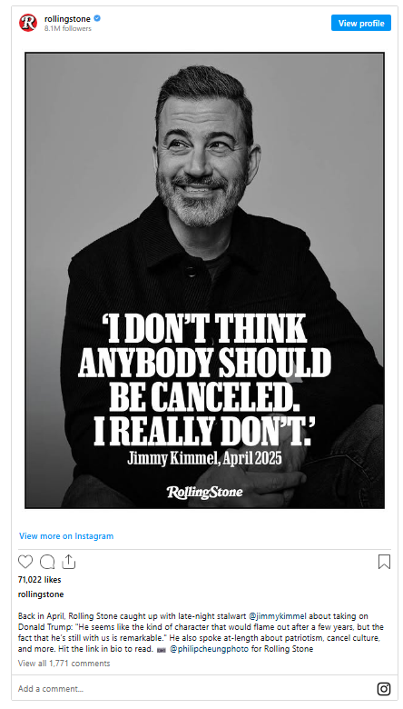 It referenced an April 2025 interview in which Kimmel told the magazine: ”I don’t think anybody should be canceled. I really don’t.”