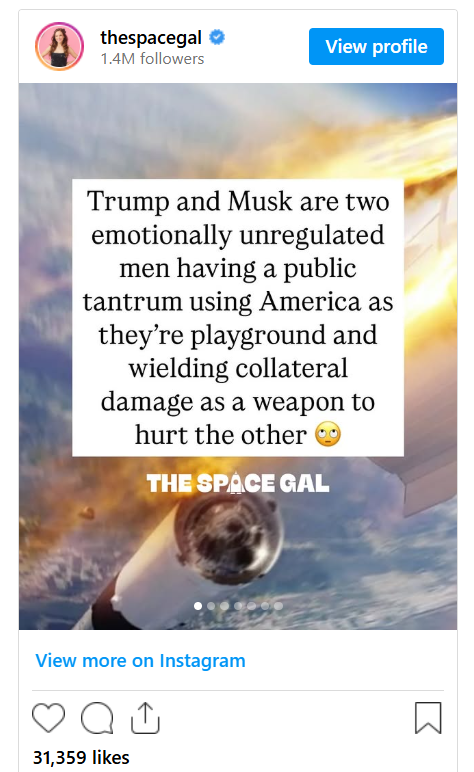“This is tweet is ROCKING the space industry right now,” Calandrelli wrote, quoting Musk’s threat: “In light of the President’s statement about cancellation of my government contracts, @SpaceX will begin decommissioning its Dragon spacecraft immediately.”
