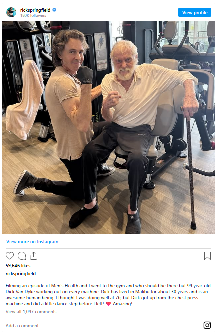 On Instagram, artist Rick Springfield posted a picture of himself and Van Dyke at a gym in Malibu, California. And it would be an understatement to say that the 99-year-old is looking amazing.