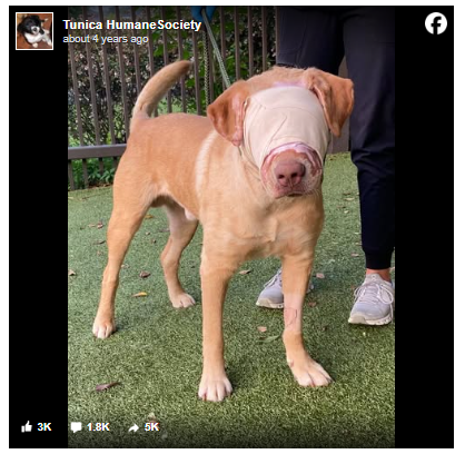 Thankfully, despite the shocking injury, Buddy doesn’t appear to have lost his eyesight. Tunica Humane Society says that doctors believed his eyes are still intact. Damage to his eye lids will be fixed surgically, and he will likely have some vision when he is healed.