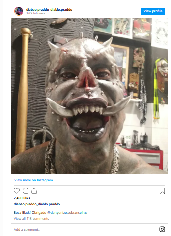 Brazilian Michel Faro do Prado, also known as “Diabão” (Big Devil), is one of the most heavily modified people on the planet. For him, body modifications are a significant part of his identity, and he’s not shy about sharing his dark world with his 300,000 followers on Instagram.