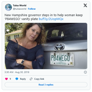 A mother of four was shocked when New Hampshire’s Division of Motor Vehicles (DMV) demanded she surrender the vanity plates she had 15 years.
