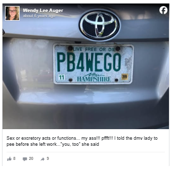 But, failing to appreciate Wendy Auger’s harmless message, the DMV determined the plates referred to “sexual or excretory acts or functions.”