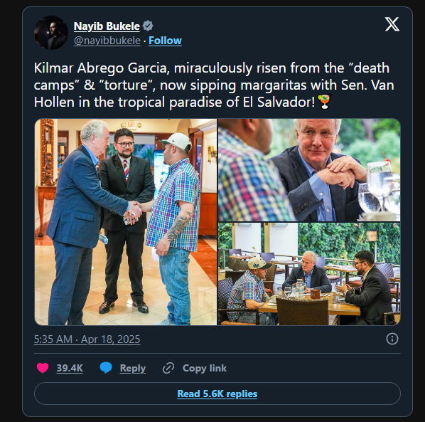 The caption reads: “Kilmar Abrego Garcia, miraculously risen from the ‘death camps’ & ‘torture’, now sipping margaritas with Sen. Van Hollen in the tropical paradise of El Salvador!”