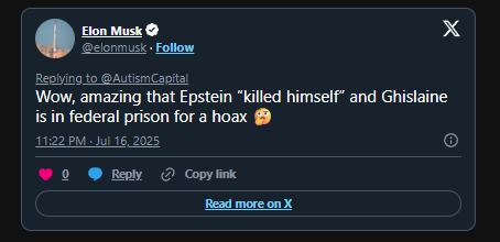 Elon Musk has since replied to a clip of yesterday’s interview and wrote: “Wow, amazing that Epstein ‘killed himself’ and Ghislaine is in federal prison for a hoax.”