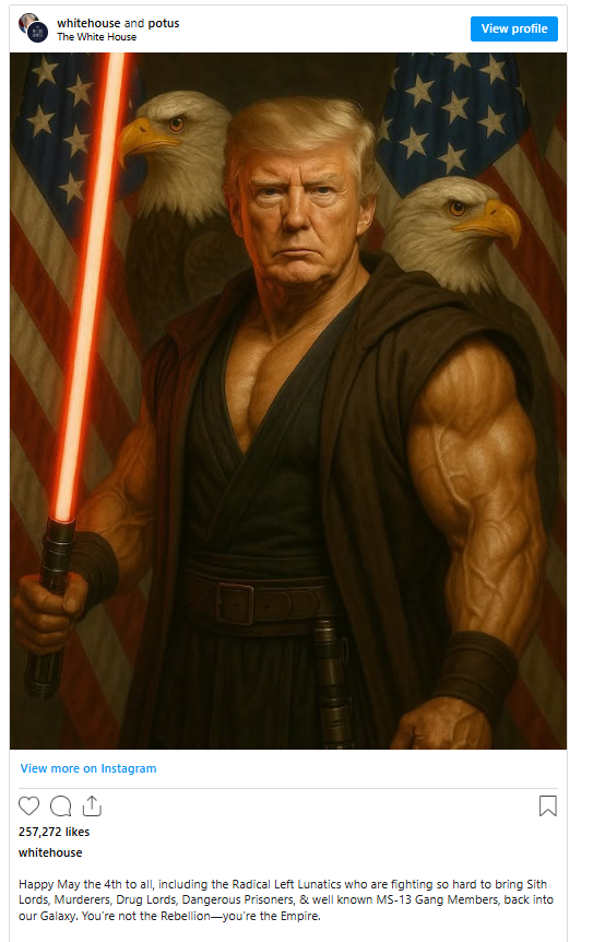 To mark Star Wars Day on May 4th — the day celebrated in honor of the iconic phrase “May the Force be with you” — the White House posted a computer-generated image of Donald Trump. In this over-the-top depiction, Trump stands muscular and almost cartoonishly buff, wielding a lightsaber in front of U.S. flags and two bald eagles.