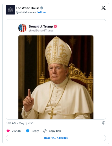 This, of course, isn’t the first AI-generated image the White House has posted of Donald Trump. Another image that stirred up strong reactions was one depicting Trump as the Pope — an image that many found insensitive, especially in light of the Pope’s recent passing. On Monday, the president responded to Catholic critics of the AI-generated image by suggesting that they weren’t truly offended.