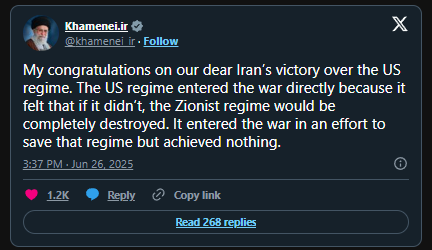 In the post, the supreme leader claimed victory over Israel and branded the US’ attacks on the country’s nuclear sites on June 21 as unsuccessful.