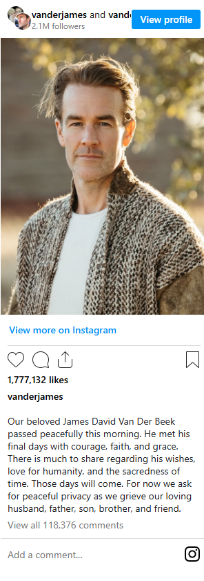 “Our beloved James David Van Der Beek passed peacefully this morning,” his wife, Kimberly Van Der Beek, said in a statement. “He met his final days with courage, faith, and grace. There is much to share regarding his wishes, love for humanity and the sacredness of time. Those days will come. For now we ask for peaceful privacy as we grieve our loving husband, father, son, brother, and friend.”