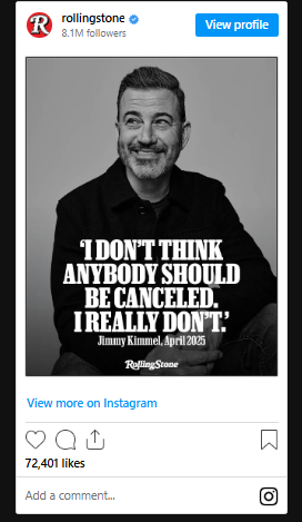 It quotes an interview from April 2025, where Kimmel told the publication: “I don’t think anybody should be canceled. I really don’t.”