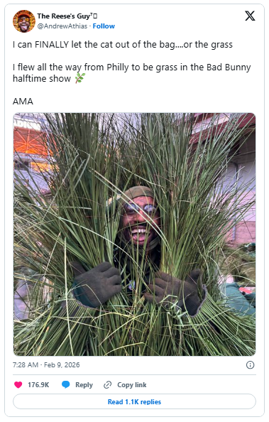 One of those leafy performers, Andrew Athias, better known on X as “The Reese’s Guy”, has now spilled the details of this very unique Super Bowl gig.