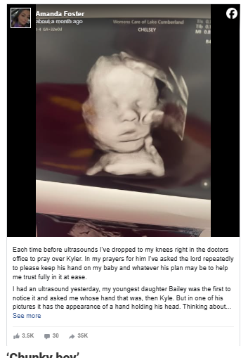 “I had an ultrasound yesterday, my youngest daughter Bailey was the first to notice it and asked me whose hand that was,” she writes in her now viral Facebook post. The post also includes a black and white image of the ultrasound, showing what she believes to be a divine presence of a giant hand cradling her son’s head. She adds: “In one of his pictures it has the appearance of a hand holding his head.”