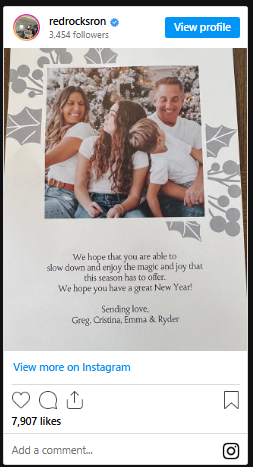 It also featured the message: “We hope that you are able to slow down and enjoy the magic and joy that this season has to offer. We hope you have a great New Year! Sending love, Greg, Cristina, Emma & Ryder.”