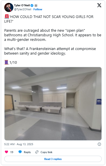 Virginia’s Christiansburg High School (CHS) has introduced a feature – an “open plan” gender-neutral bathroom that the school suggests will make students feel more comfortable.