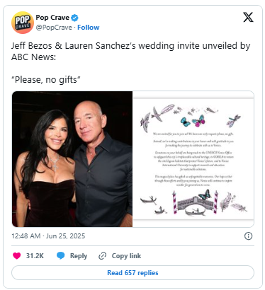 Despite the trolling, Bezos and Sanchez seem undeterred. With Venice as their backdrop, A-listers arriving by the hour, and celebrations already in motion, the couple is determined to make their big day unforgettable — haters, protests, and bad font choices be damned.