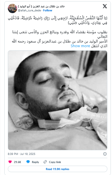 “With hearts full of faith in Allah’s decree and destiny, and with profound sadness and sorrow, we mourn our beloved son Prince Al-Waleed bin Khaled bin Talal bin Abdulaziz Al Saud, may Allah have mercy on him, who passed away to Allah’s mercy today,” he wrote in Arabic, announcing the death of his eldest son.