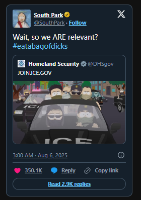 But in an apparent U-turn from the administration, Homeland Security used an image of a South Park scene to encourage people to join US Immigration and Customs Enforcement (ICE).