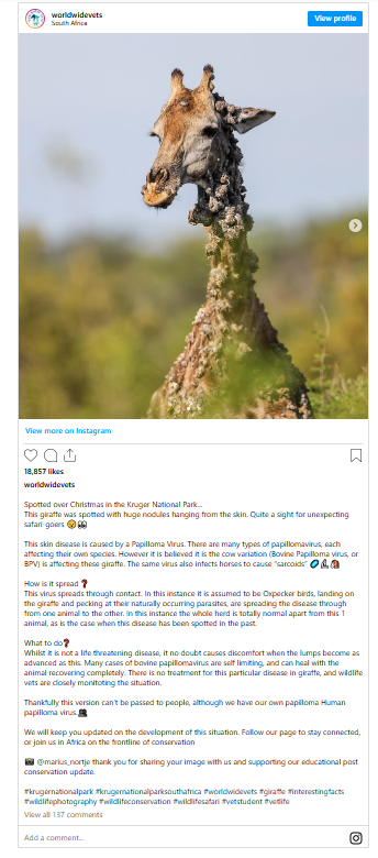 “There are many types of papillomavirus, each affecting a specific species. However, the cow variation (Bovine Papillomavirus or BPV) is believed to affect this giraffe,” Dr. Campling explained.