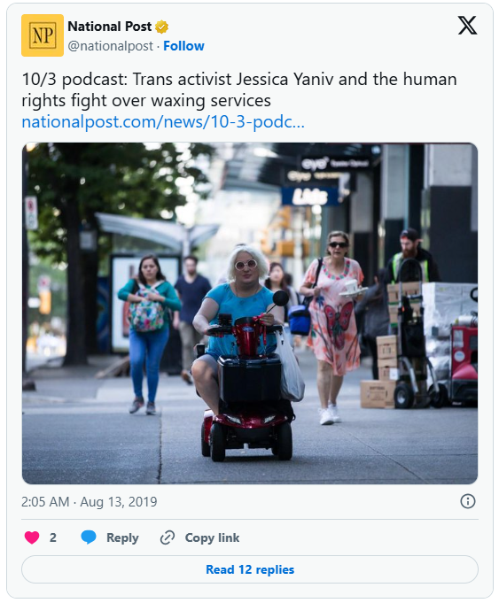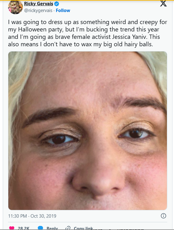 Gervais later shared on X: “I was going to dress up as something weird and creepy for my Halloween party, but I’m bucking the trend this year and I’m going as brave female activist Jessica Yaniv. This also means I don’t have to wax my big old hairy balls.”