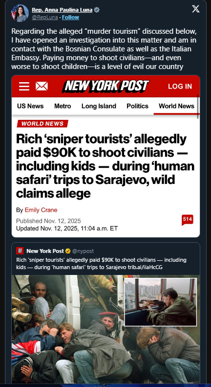 “Regarding the alleged ‘murder tourism’ discussed below, I have opened an investigation into this matter and am in contact with the Bosnian Consulate as well as the Italian Embassy,” she wrote.
