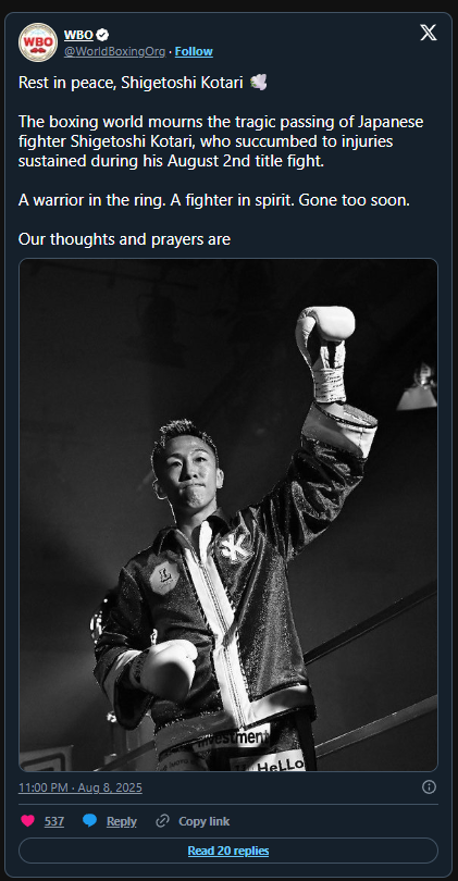 “Rest in peace, Shigetoshi Kotari. The boxing world mourns the tragic passing of Japanese fighter Shigetoshi Kotari, who succumbed to injuries sustained during his August 2nd title fight.
